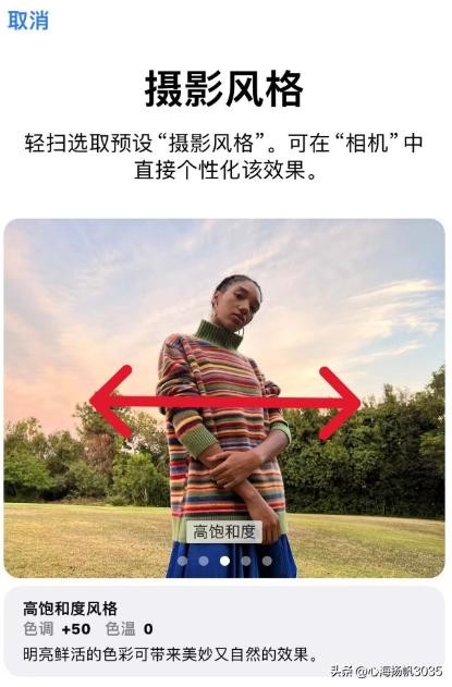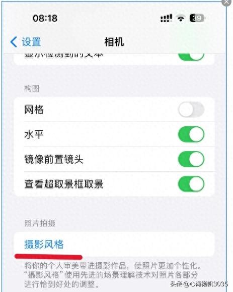 1、设置摄影风格。首先打开设置,找到相机打开,在相机里找到摄影风格打开,看到中间的人物,然后左右滑动,找到对应的风格,不同型号和系统的手机,里面的摄影风格的选项会不同,主要有标准、暖色、冷色、高饱和、高对比选项,找到你喜欢的风格就可以了。