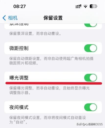 2、设置曝光度,使相机自带美颜和提高清晰度。第一步首先打开设置,找到相机,在相机中找到保留设置项打开,在里面打开曝光调整。第二步,打开相机app,点击左上角曝光度,然后再下面曝光度调整条,将曝光度调整为0.3到0.7就可以了。(照片、视频还有前置摄像都按这个方法调整)这样调整完相机自带美颜,并且图像清晰。