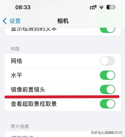 3、相机自拍时出现脸不正的问题设置。打开设置,找到相机打开,在下面找到镜像前置镜头,把这个开关打开。这样照相时就会左到右成像,就会原照片成像,不会再出现脸歪不正的问题。