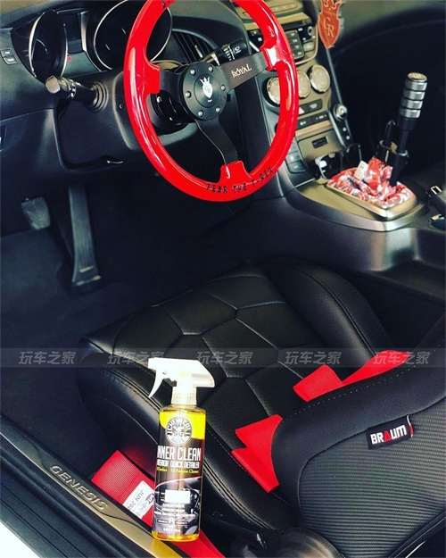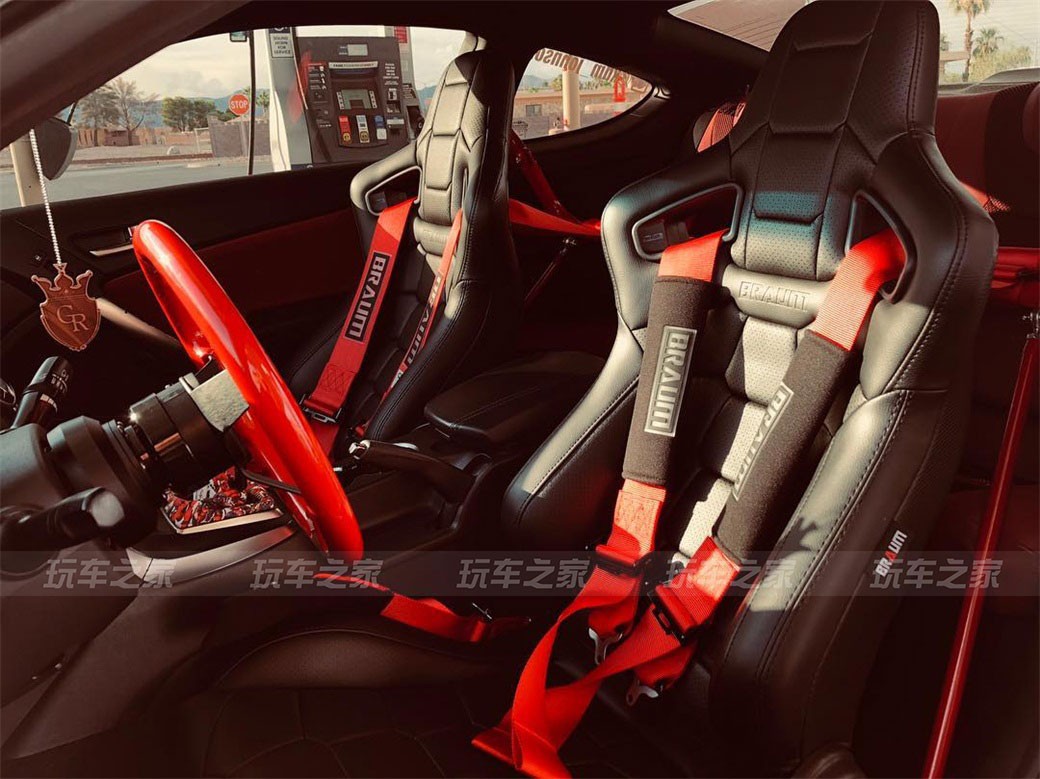 内饰方面,Dustyn的目标是打造具有竞技风格驾驶室,为此花了不少心思,换了快拆方向盘、Braum赛车座椅、防滚架等,还替换了《死侍》元素的排档杆套。