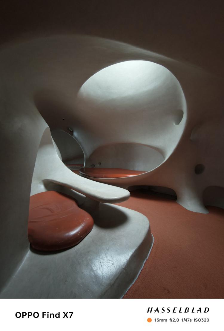 这张照片在拍摄时其实处于暗光环境,整个场景并没有任何人造光源,靠的只有顶部的开孔洒下的自然光线。Find X7 不仅反映出了真实的光线环境,还完美的还原出了墙壁的光泽感,座椅的划痕放大画面也没有糊在一起,整张照片并没有无脑的进行拉亮,而超广角镜头由于焦段问题产生的画面边缘畸变在 Find X7 上也没有出现。