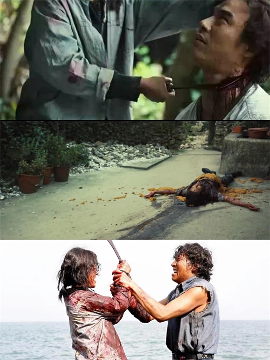 然后让人猝不及防地,金福南拿起了锈迹斑斑的镰刀,卯足了劲,猛劈下来,“噗”一声闷响,镰刀插入其中一个老女人的脖子,鲜血直流。