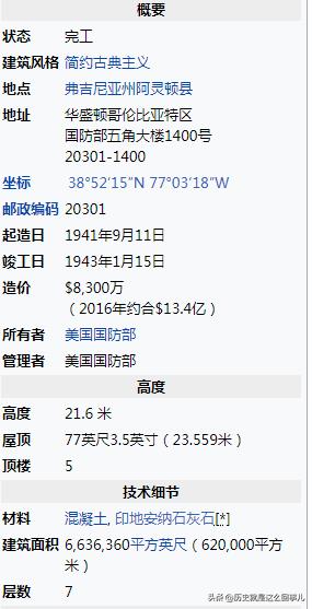 五角大楼建设于波托马克河的漫滩上,因而特殊的土壤条件给工程师提出的很大挑战。整个建筑地块的海拔高度也不尽相同,介于10至40英尺(合3至12米)之间,所以修建了两座巨大的挡土墙用以弥补海拔高度的差别,并打下桩基来处理土壤条件[26]。全部工程耗时16个月,共耗资8300万美元完成,其建筑高度为77英尺(合23米),五个外立面每侧长度为921英尺(合281米)。