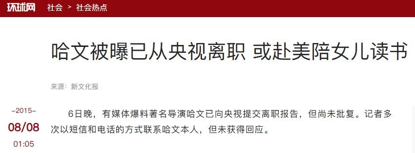 环球网2015-08-08:哈文被曝已从央视离职 或赴美陪女儿读书