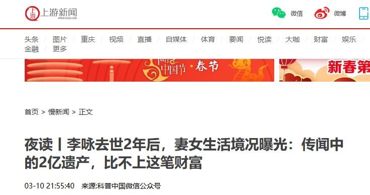 上游新闻03-10夜读丨李咏去世2年后,妻女生活境况曝光:传闻中的2亿遗产,比不上这笔财富