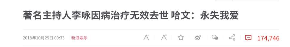 新浪娱乐2018-10-29:著名主持人李咏因病治疗无效去世 哈文:永失我爱