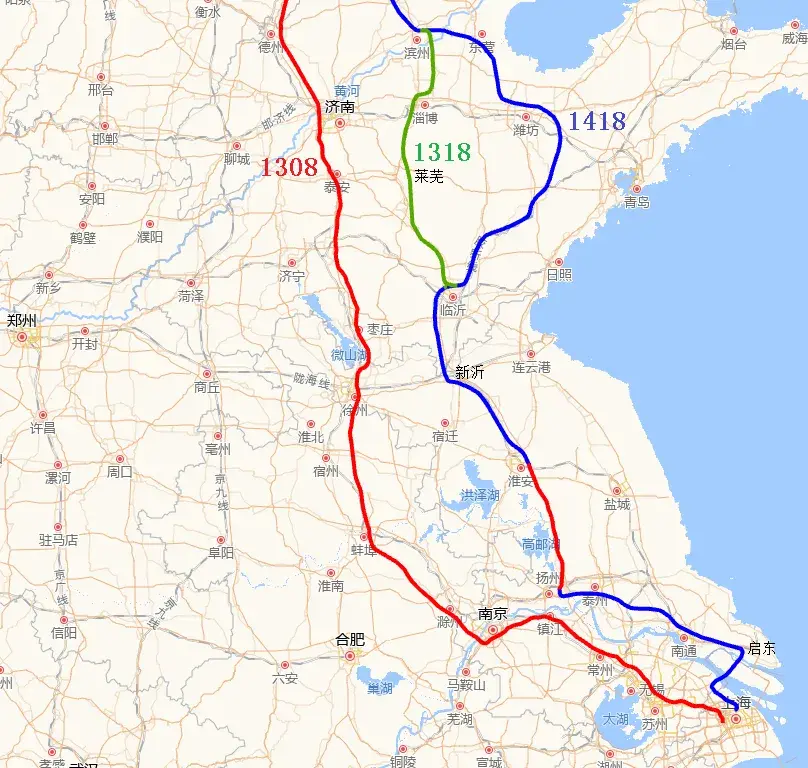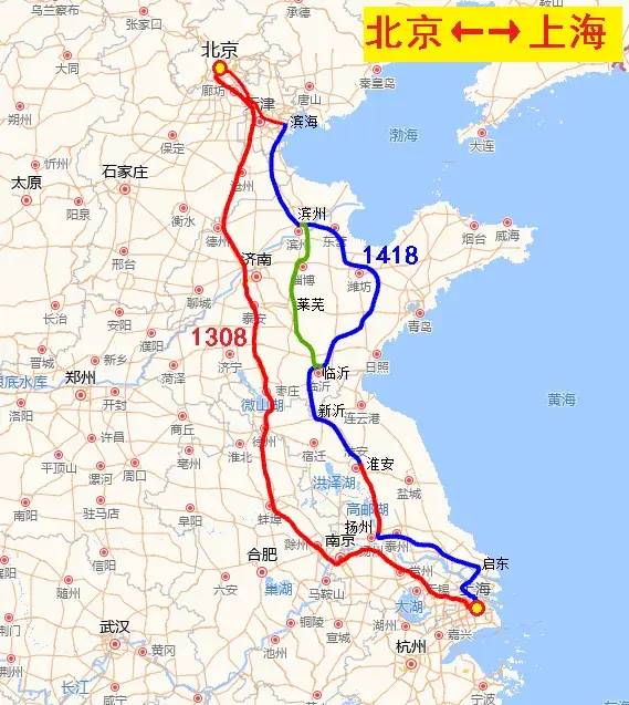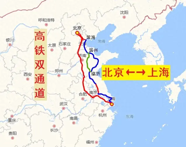 2016年7月,国家发展改革委、交通运输部、中国铁路总公司联合发布了《中长期铁路网规划》,明确提出加快建设“八纵八横”高速铁路骨干网,并对“八纵”之一的京沪高铁大通道规划了两条线路:京沪高铁一线走向为“北京~天津~济南~南京~上海”,此线路为京沪高铁主通道,里程短,速度快,可开行大站快车;京沪高铁二线走向为“北京~天津~东营~潍坊~临沂~淮安~扬州~南通~上海”,该线路为京沪高铁辅助通道,即大家常说的京沪高铁二线,里程稍长,设站较多,服务沿线众多中小城市,连接华北、华东地区,贯通京津冀、长三角等城市群。
