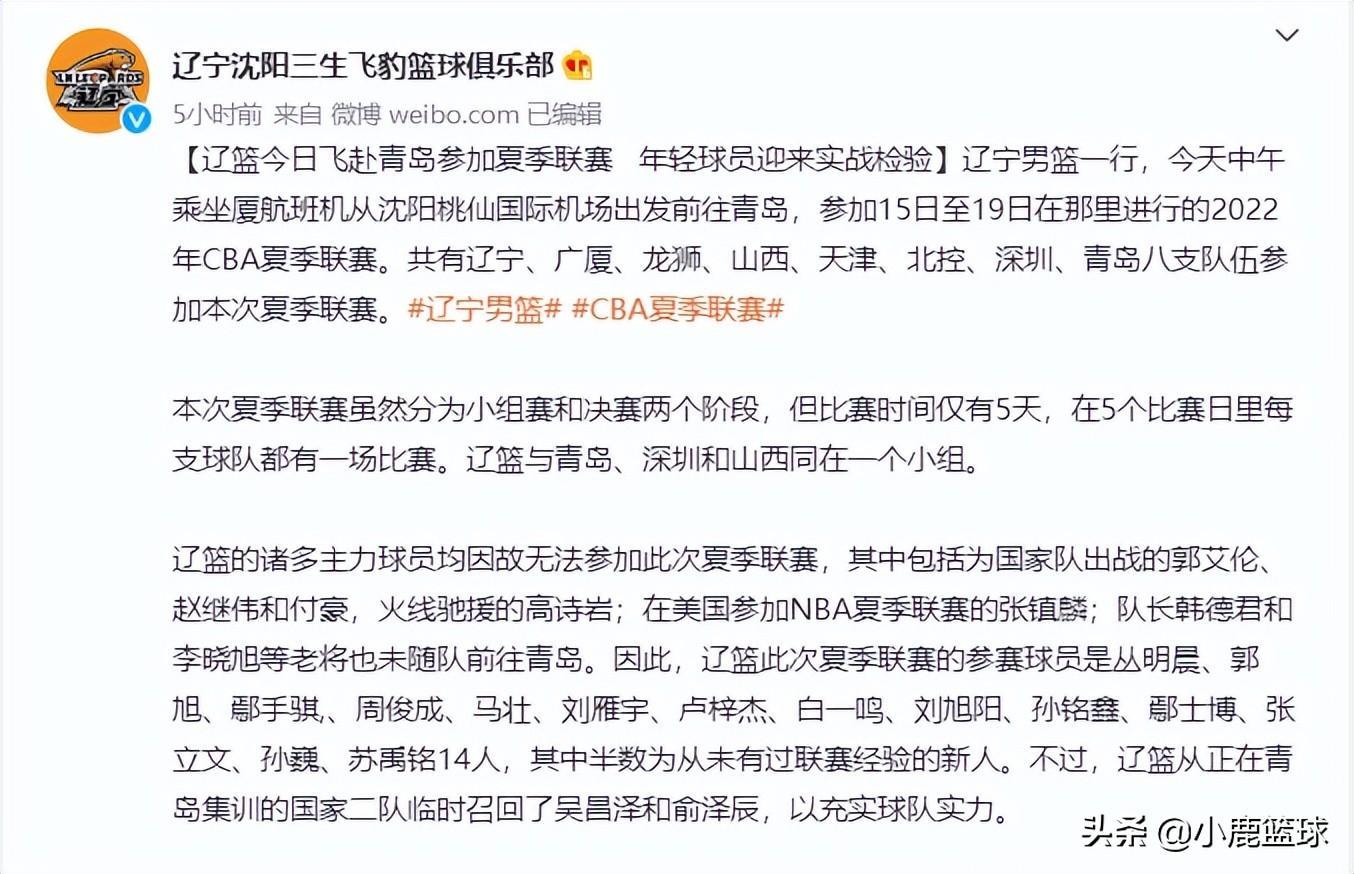 辽宁男篮已经飞往青岛参加夏季联赛,此次夏季联赛共有八支球队参加,分别是辽宁、广厦、广州、山西、天津、北控、深圳、青岛。此次夏季联赛,辽宁男篮重点培养年轻球员,除了郭艾伦、赵继伟、付豪等人无法出战之外,韩德君和李晓旭两位老将也没有随队出征,杨鸣主要还是锻炼年轻球员,共上调了7名年轻小将,丛明晨压阵。