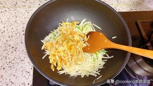 茭白炒片刻后加入鸡蛋丝,放料酒、白糖、盐、鸡精,半碗水,我放了酱油、但是大家可以不放出锅颜色更好看,就按平时炒菜的方法就行了,