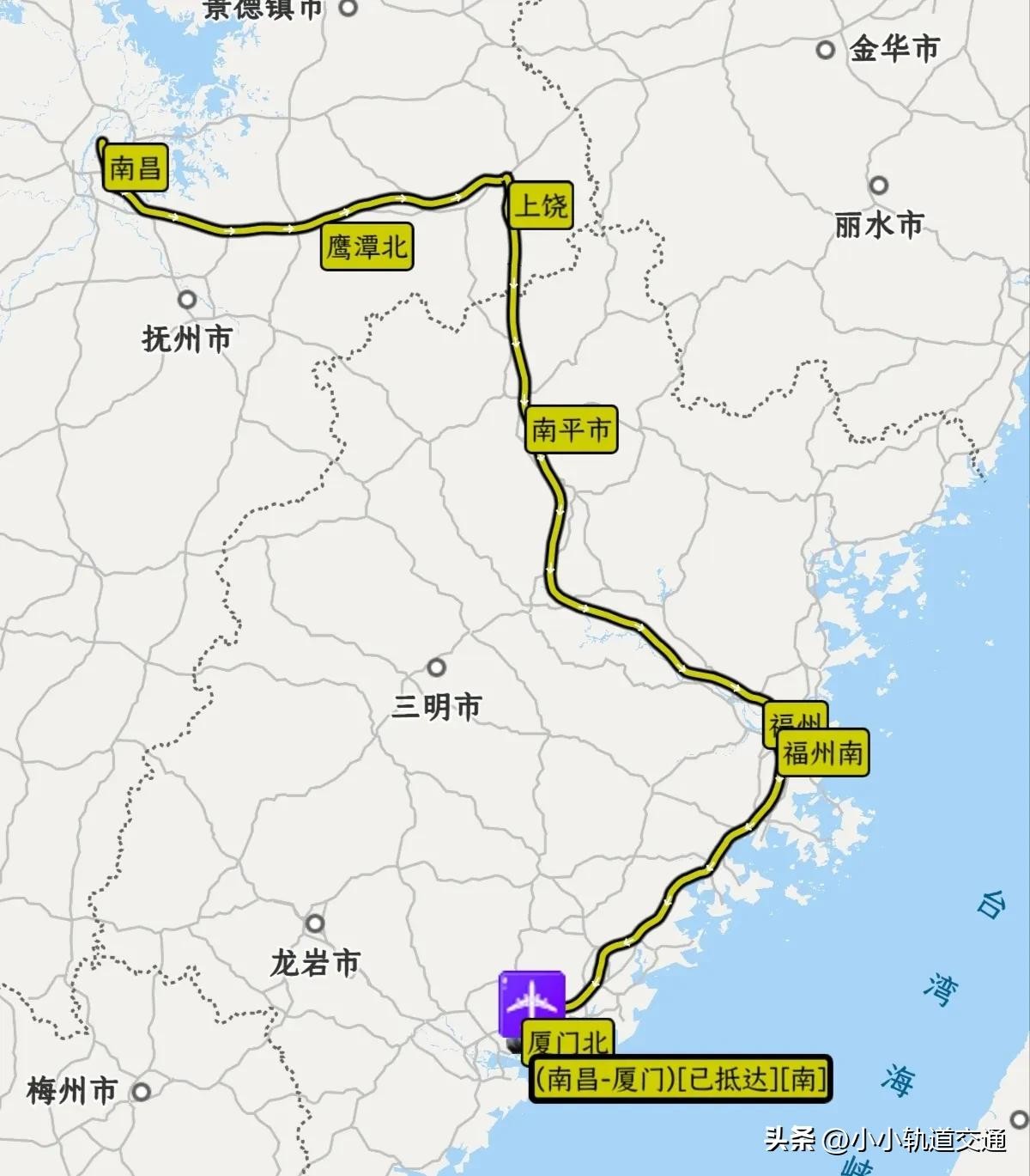 这三条线路的走向完全不同,涵盖了南北中三个方向,其中第一条是G5314次列车行走的路线,大致为南昌出发后经沪昆高铁上的鹰潭和上饶前往福建南平,然后转向省会福州,最后通过沿海通道前往厦门,这条线全程耗时4小时7分钟,全程二等座396元。这条线到厦门时间最短,当然票价也是最高的。