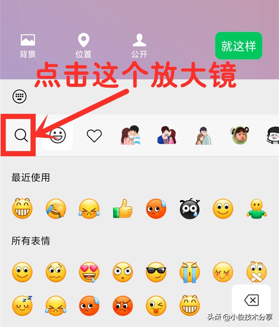 接着点击的【笑脸】也就是【表情符号】的图标,然后选择【放大镜】