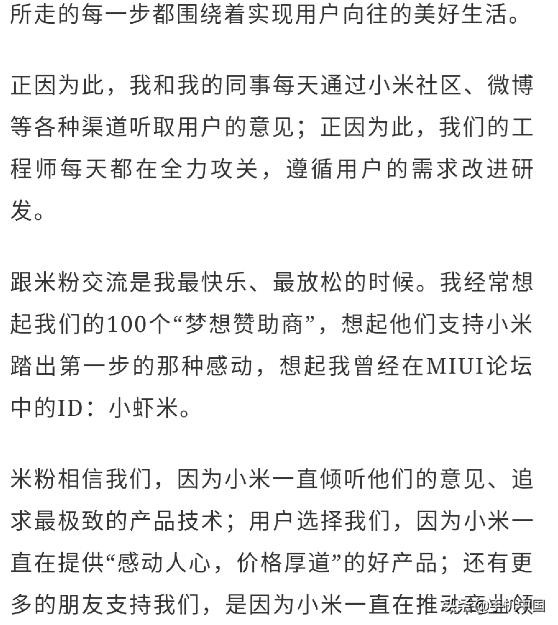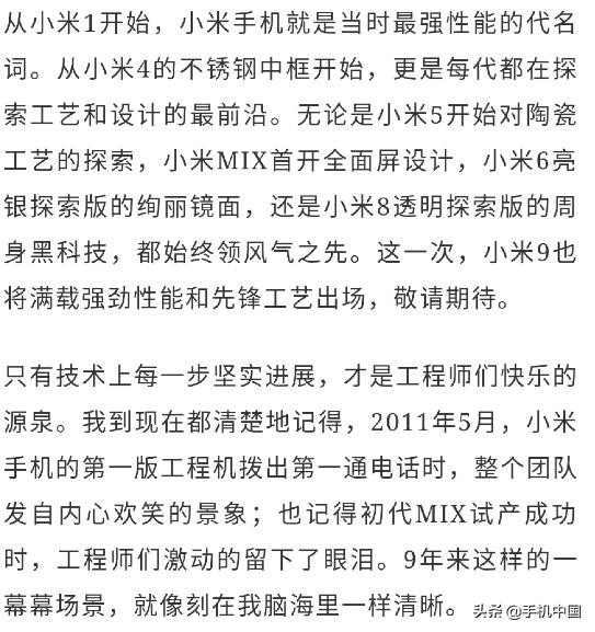 小米为热爱而战、为工程师的技术信仰而战。正是小米工程师在技术上的“吹毛求疵”,工艺上的精心打磨,以及所拥有的勃勃野心,才做出了一代又一代小米的精品旗舰。不管是最强性能的小米1还是不锈钢中框的小米4,亦或是首开全面屏设计的小米MIX,小米工程师的探索从未停止。雷军还附上了2011年时自己听小米手机的第一声初啼的照片,充满了情怀已经热爱。