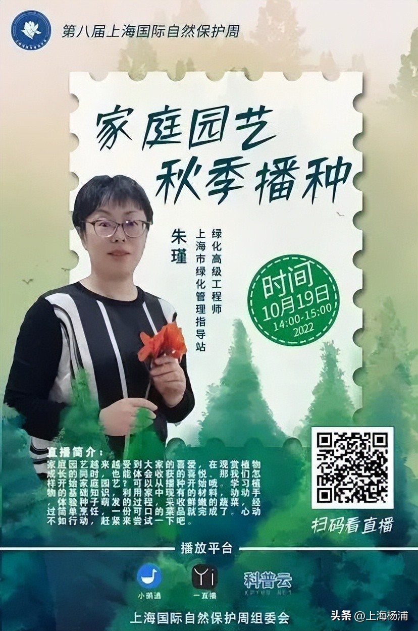 第八届上海国际自然保护周将于2022年10月27日至11月4日举行。10月19日14:00,上海市绿化管理指导站绿化高级工程师朱瑾老师在直播间展开家庭园艺知识科普,并现场为大家演示种植过程。
