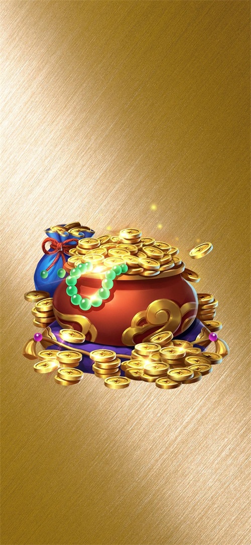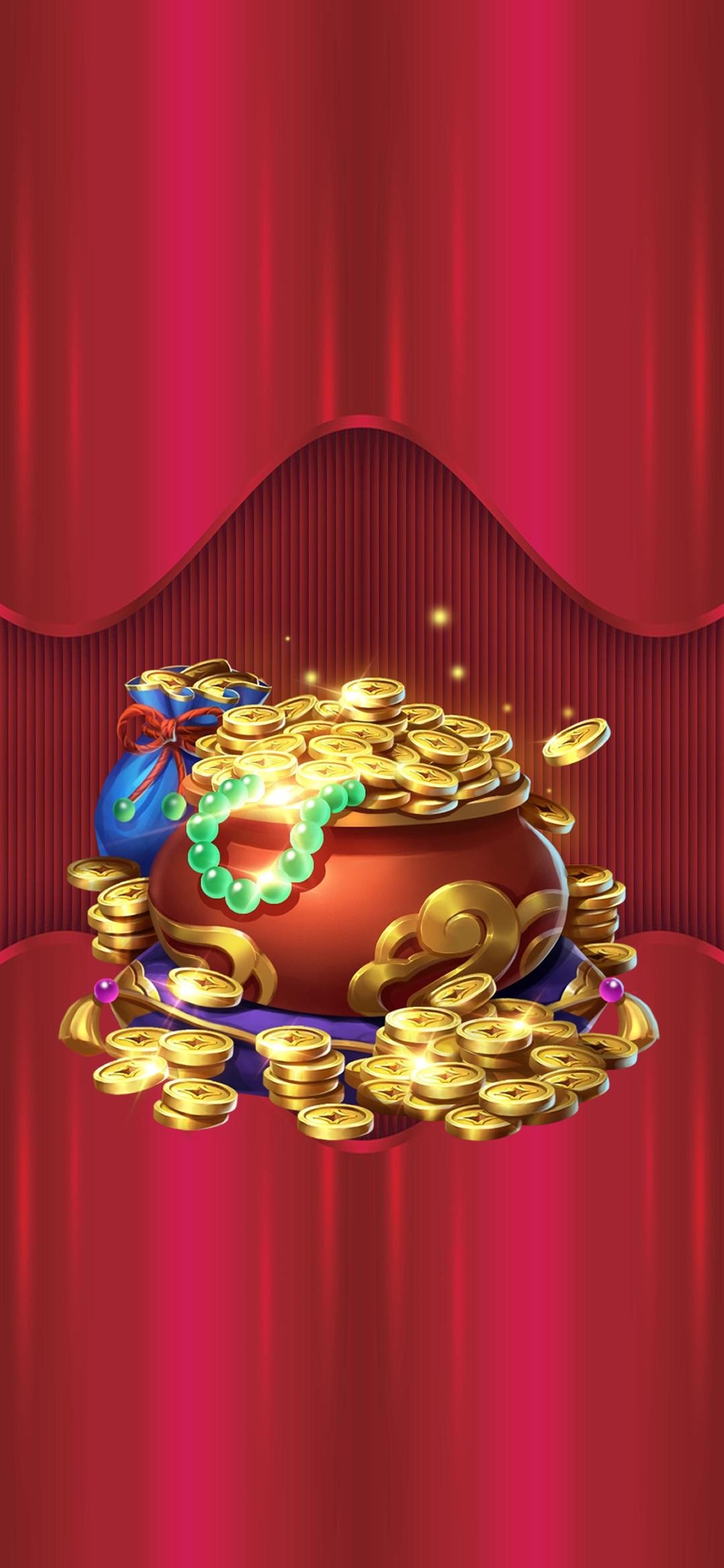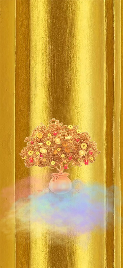 下面这张壁纸,福图一刻用2张图片拼接成背景,中间放置了聚宝盆和珠宝元素。