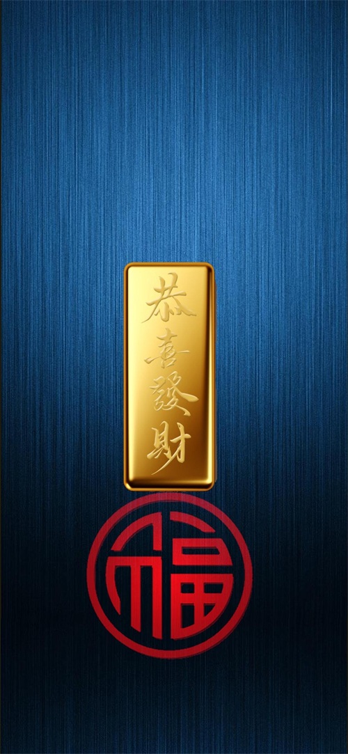 下面这张壁纸,福图一刻用竖纹蓝色拉丝金属为背景,放置了金条元素,我在上面放置了“恭喜发财”元素,下方放置了渐变福字。