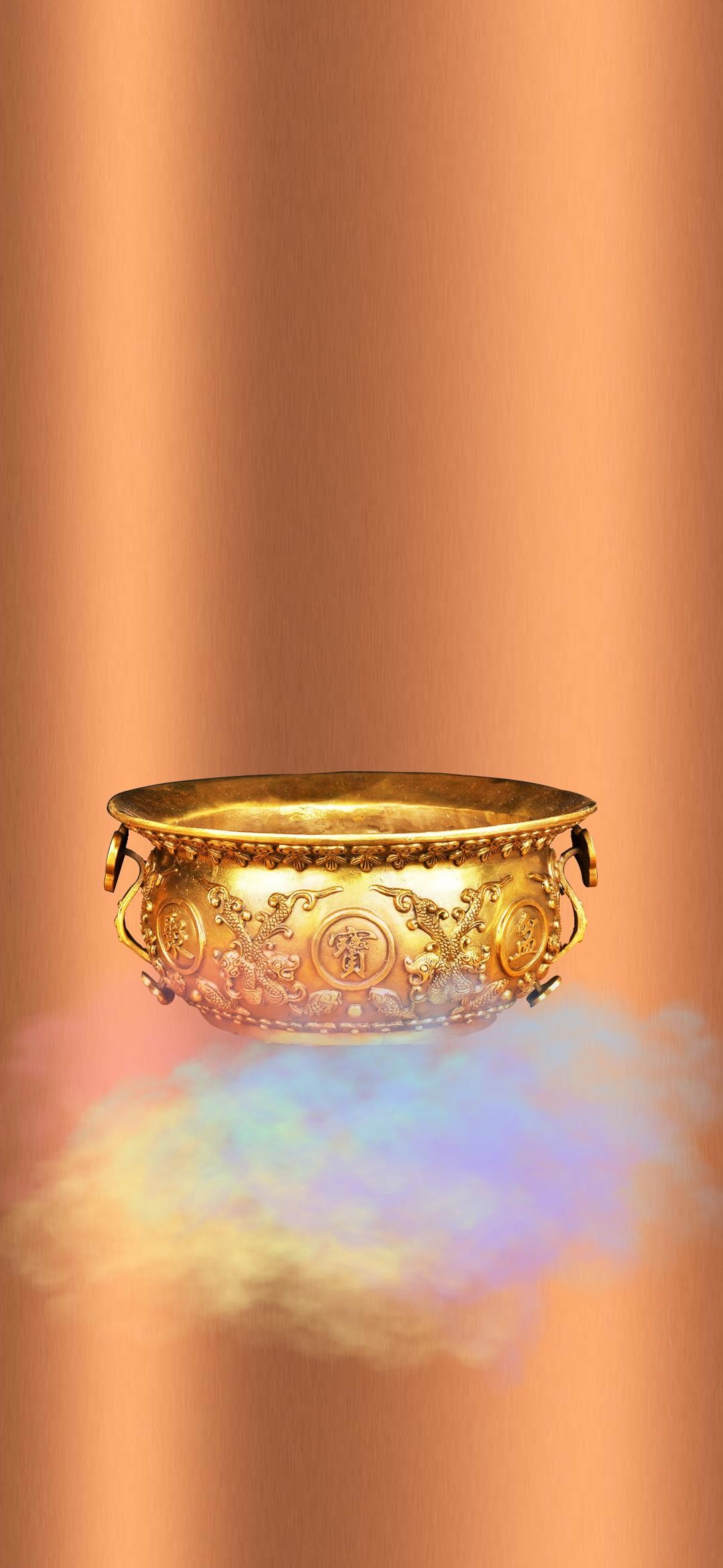 下面这幅壁纸,与上图相比,我更换了聚宝盆元素,紫铜色的渐变背景,配上铜色聚宝盆,财运滚滚来呀!