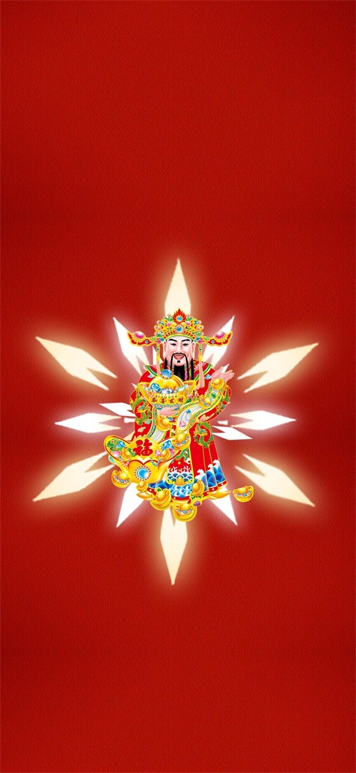 下面这张壁纸,福图一刻在红色布纹背景上,放置了财神爷元素,我在财神爷背后还放置了一个独特的光芒,寓意生活光明,财运亨通。