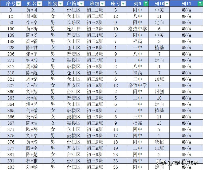 数据整理如下:整理后可以发现该校通过入校考试成绩高低安排座号,录取点位大多为各班座号前20,30号后基本没有一类校录取点位,重点班一看便知。