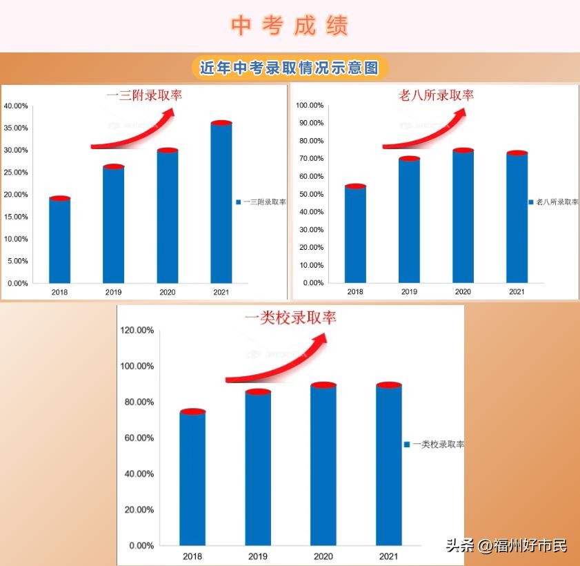 在福州100%私立摇号落地前,该校升学率长年上升,于2020年登上私立三甲宝座,仅次于台华和时代。2022年根据家委统计,当年福州日升中学中考总平均分 721,录取一三附(含中*班)录取率达35.22%。