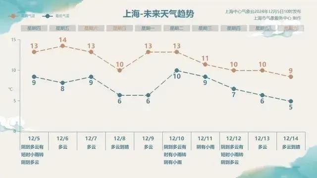 据气象局的预报,明天和周六将是上海的“转晴时刻”。从周五开始,天气将以多云为主,气温保持在8~14℃之间,白天气温适宜,适合户外活动。但到了周日,气温将明显下降。冷空气的入侵将导致气温急剧下滑,预计全天气温将在10℃以内,风力增大,风寒效应明显。市民外出时请适当加衣,注意保暖。