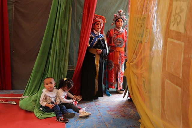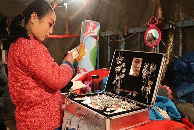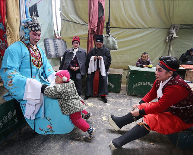 枣梆戏发源于梁山县拳铺镇方庙村,是市级非物质文化遗产,属于古运河文化的产物。绪初年,山西有个上党梆子“十万班”来鲁西南地区演出,历时一年之久,鲁西南地区会喜欢唱戏的人纷纷到“十万班”,拜师学艺深造。接着,从河北临铭关来唱“泽州调”的演员与鲁西南老艺人们又经过多年的探讨、研究,发掘了流传在皇宫的曲子和民间小调融合在唱腔里面,形成了一个比较完美的、别具一格的剧种。到了清朝末年,枣梆戏已发展到了河南的濮阳、河北的邯郸、山东鲁西南地区。枣梆戏,具有浓郁的乡土色彩和地方风格,她既有上党梆子的特色,又有皇宫的曲调,所上演的剧目由老艺人口传下来的有100多回,大多取材于民间演义小说,如歌颂忠臣的《天波楼》,也有行侠仗义的《水浒》戏,如《李逵坐县衙》、《时迁打铁》、《宋江杀惜》、《潘金莲坐楼》等。在艺术方面,枣梆戏家底雄厚,角色行当齐全,分工严格,表演程式完整,具有独特风格。该组图片拍摄于2014年,每年进入冬季梁山枣梆剧团就开始辗转各地演出。(李继保 摄)