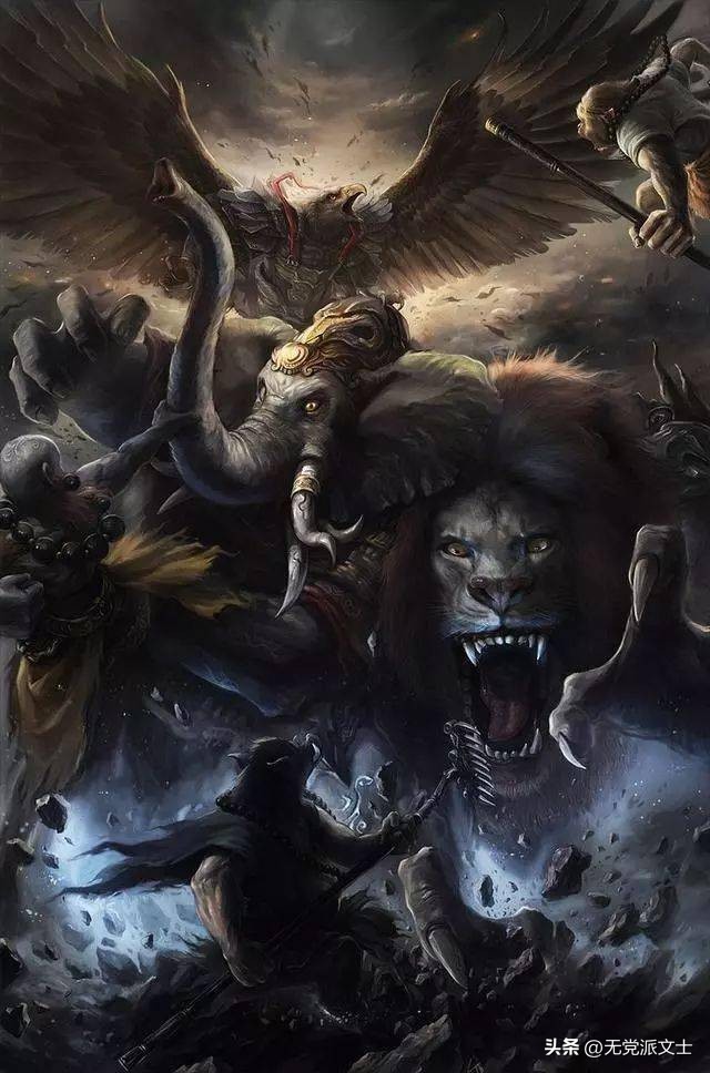 大鹏精一个下到狮驼国,把狮驼国的几万人全部吞了,吃了喝了,建立了万魔狮驼国。看一看原版的恐怖画面: