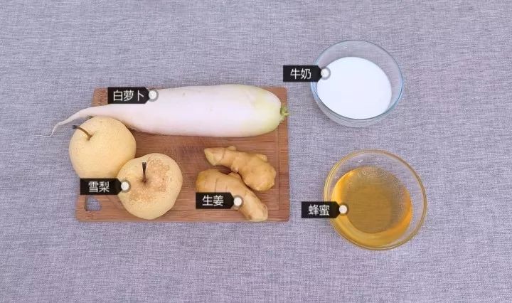 雪梨和白萝卜是止咳化痰润肺的,生姜可以驱寒开胃,蜂蜜可以起到润肠通便的作用,牛奶则能补肺养胃、生津润肠。▽
