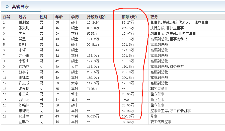 大华股份因为体量的原因,目前营收在300多亿,相较于海康威视的800亿,还是要低不少的,所以大华股份的高管们,收入是要低于海康威视的高管们的,但是也可不可以理解,海康的高管们拿的比员工的要多一些。