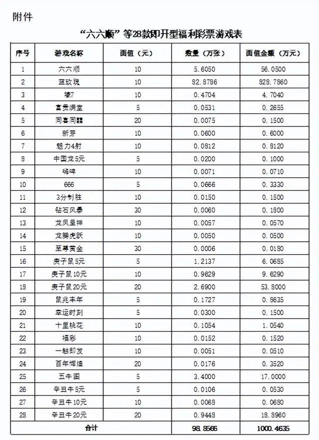 一、同意你中心采用粉碎方式组织销毁已经停止销售的 " 六六顺 " 等 28 款即开型福利彩票,共计 98.8566 万张,票面总值共计 1000.4635 万元。具体数量和票面价值见附件。