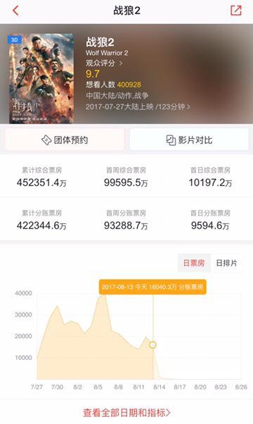 根据猫眼专业版实时票房数据显示,《战狼2》在8月13日18:59累计票房45.06亿人民币。根据BoxOfficeMojo票房数据显示,全球票房排第99名的影片为《蜘蛛侠:英雄归来》,全球票房为6.79亿美元(换算成等值人民币约为45.22亿)。