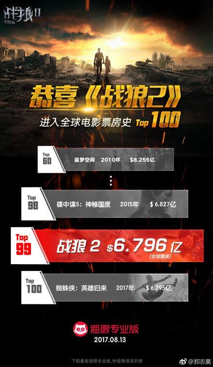 要是说到这历史性的一刻的创造者,我想电影爱好者肯定不陌生,这历史性的一刻的创造者就是最近红得发紫的由吴京自导自演的《战狼2》,而这历史性的一刻就是《战狼2》的总票房跻身全球票房TOP100。