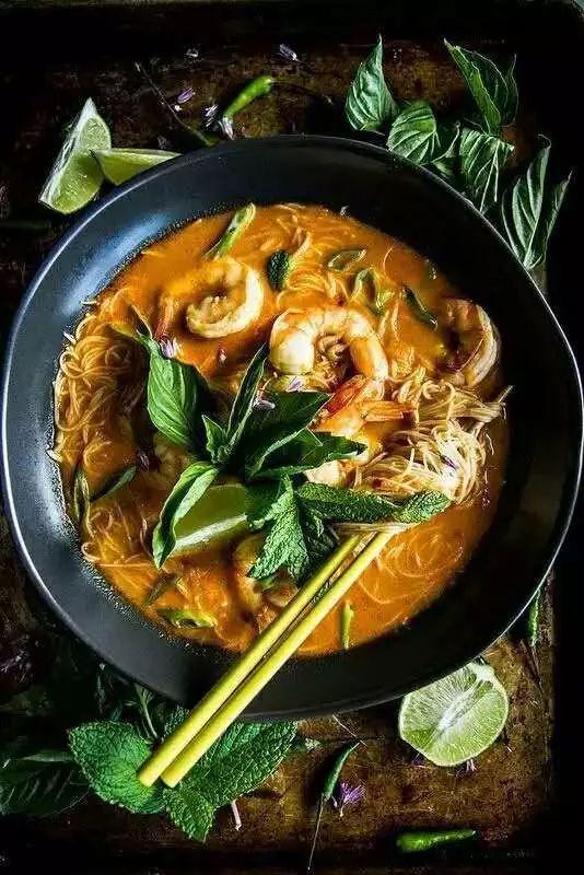 这是马来西亚最为出名的香辣汤,汤里配有米粉、海鲜、鱼排、豆腐块、蔬菜、水煮蛋、香菜和红辣椒酱,味道鲜美,香气扑鼻。这是一道经典的华人菜肴,融合了马来西亚和新加坡的各种风味。米粉汤地域区别明显,有些地方的海鲜米粉汤也加入了鸡肉。一般来说,周围环境越是简单,咖喱米粉汤就越是美味。所以,在槟城小街边的大排档里或在新加坡美食街上,你就可以享受到一碗正宗的海鲜米粉汤。