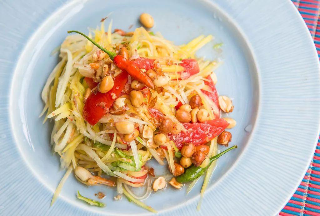 小小的一碗青木瓜沙拉里却融合了泰国四大主要的风味:酸、咸、甜、辣,给你带来各种感官上的刺激。青木瓜沙拉的基本配料有以下几种:棕榈糖、大蒜、酸橙汁、鱼露、酸角汁、虾干、海鲜、西红柿、胡萝卜、豆子和花生,你可以在生的青木瓜块中加入你喜欢的配料,搅拌均匀即可食用。在泰国北部,青木瓜沙拉通常和烤鸡和糯米一起食用。如果你在家自制这道美味时买不到青木瓜,你也可以用生的芒果、苹果或黄瓜代替,但风味也会有所改变。