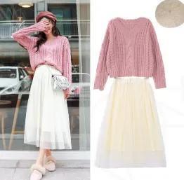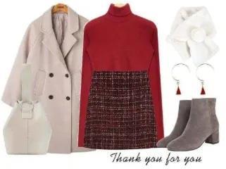 示范搭配:红色高领毛衣+粉色外套+白色帆布鞋+白色背包+红色格子短裙+灰色高跟鞋+白色围巾+圆耳环