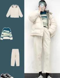 示范搭配:白色外套+白色长裤+白色背包+黑色运动鞋+墨镜+蓝色条纹毛衣