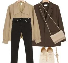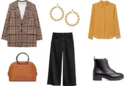 示范搭配:黄色圆领长袖衬衫+棕色条纹外套+橙色背包+黑色靴子+黄色耳环+黑色长裤