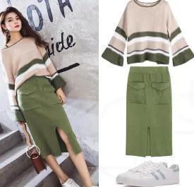 示范搭配:粉色条纹长袖衬衫+绿色长裙+棕色手提包+白色球鞋