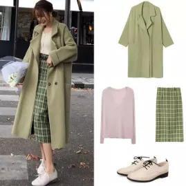 示范搭配:粉色V字领衬衫+绿色格子长裙+银色背包+米色单鞋+绿色外套