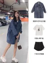 示范搭配:港风牛仔中长外套+白色短袖衬衫+白色运动鞋+黑色斜挎背包+黑色牛仔短裤