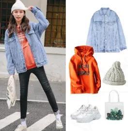 示范搭配:橙色卫衣+蓝色牛仔外套+米色帽子+白色运动鞋+米色背包