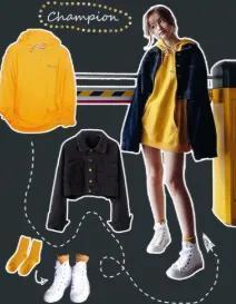示范搭配:黄色卫衣+黑色外套+黑色背包+白色运动鞋+白色短裤+黄色长袜