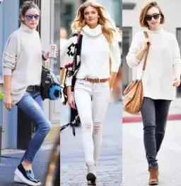 示范搭配:白色高领毛衣+蓝色牛仔裤+黑色手提包+黑色运动鞋+墨镜