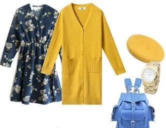 示范搭配:黄色针织长款外套+蓝色连衣裙+蓝色双肩背包+红色高跟鞋+白色短裤+黄色帽子+手表+黄色帽子