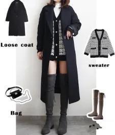 示范搭配:蓝色外套+黑色长裤+黑色斜挎背包+格子衫针织毛衣+灰色高筒靴+白色圆领衬衫+黑色短裤