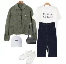 示范搭配:绿色外套+黑色长裤+黑色手提包+白色球鞋+白色帽子+白色短袖衬衫