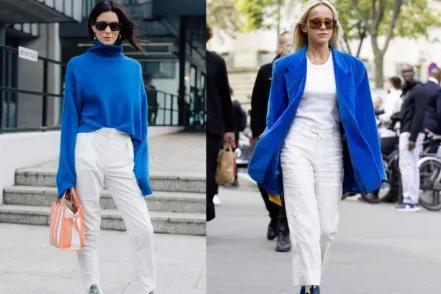 示范搭配:蓝色长袖毛衣+白色长裤+粉白色手提包+灰色高跟鞋+墨镜