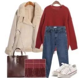 示范搭配:红色圆领毛衣+白色外套+白色帆布鞋+红色背包+蓝色牛仔裤+红色格子短裙
