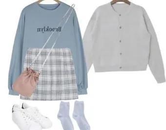 示范搭配:蓝色圆领长袖衬衫+灰色格子短裙+卡其色斜挎背包+白色运动鞋+灰色袜子