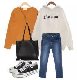 示范搭配:橙色V字领针织外套+蓝色牛仔裤+黑色背包+黑色帆布鞋+白色卫衣