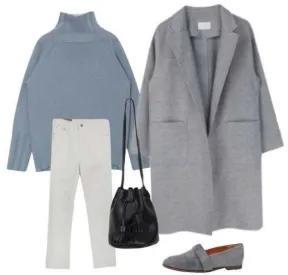 示范搭配:蓝色高领毛衣+灰色外套+灰色单鞋+黑色背包+白色长裤